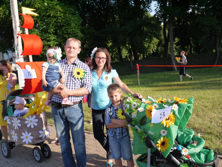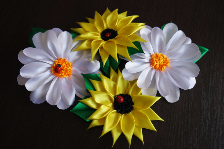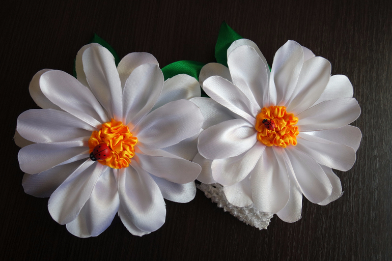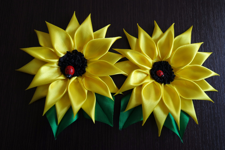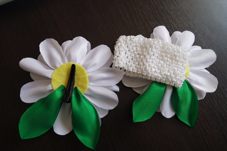 У нас с дочей были ромашки - у нее лента, у меня заколка, а у сына с мужем броши подсолнухи.