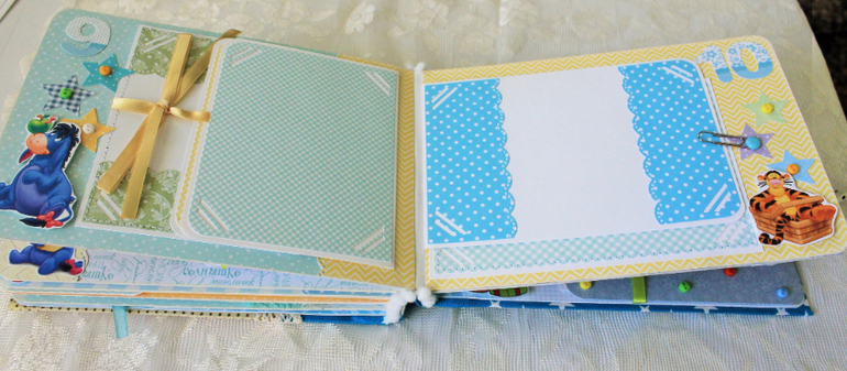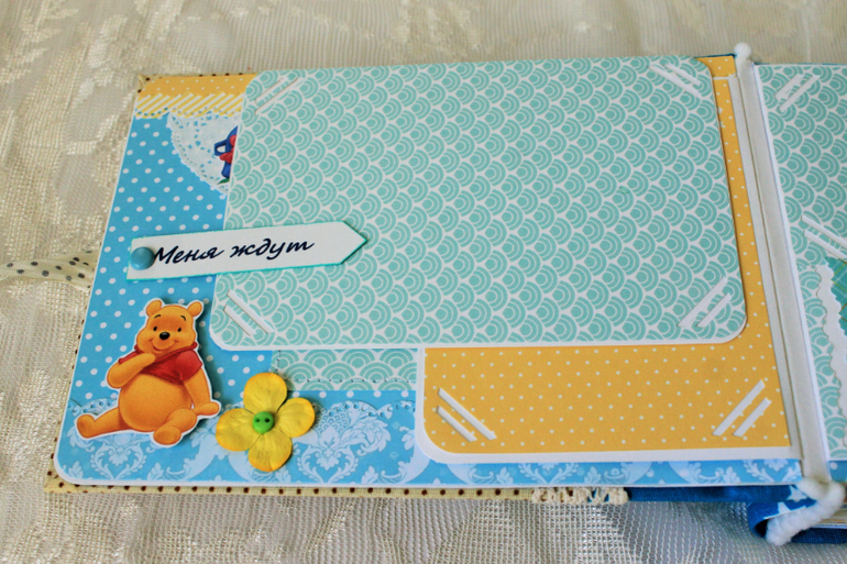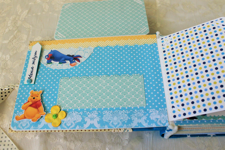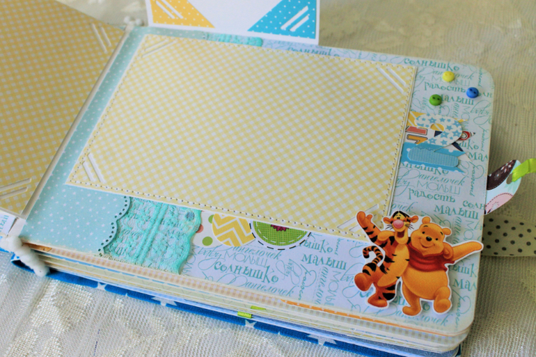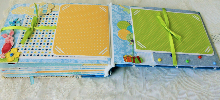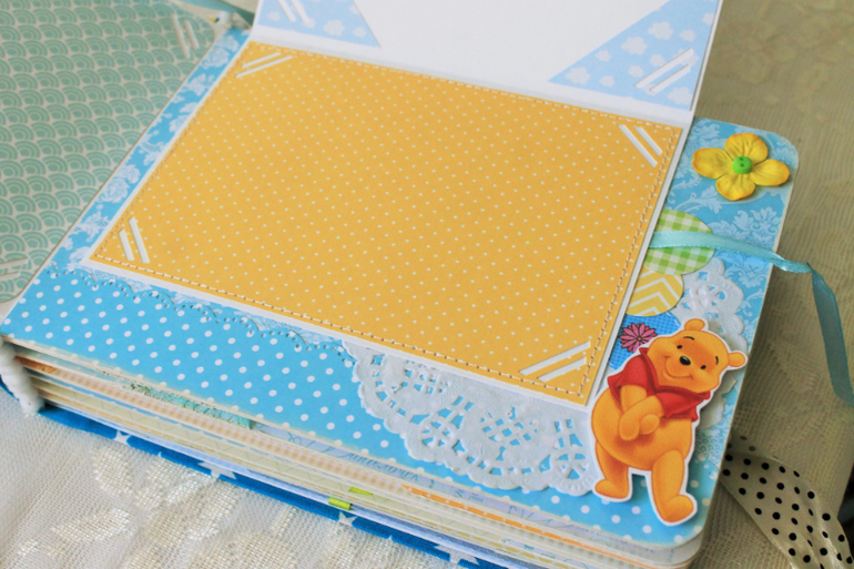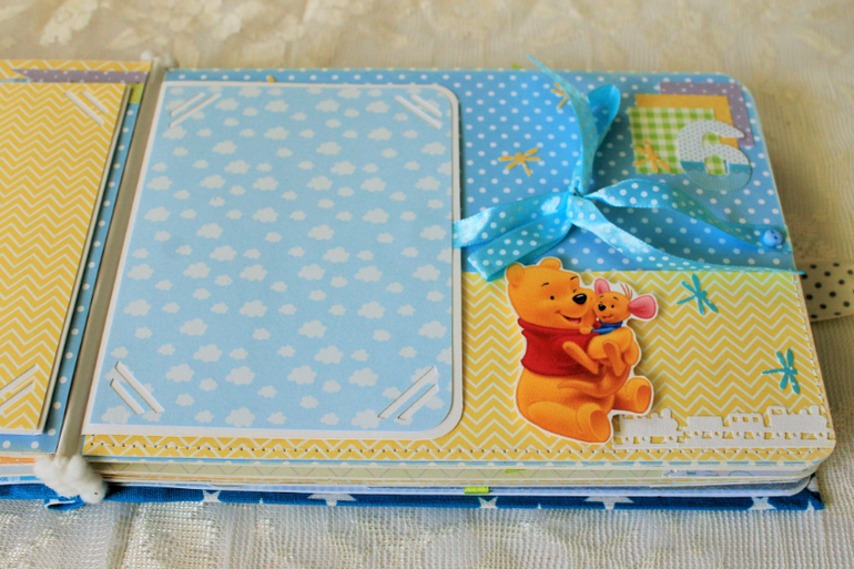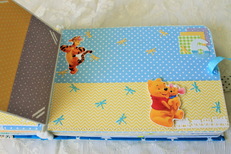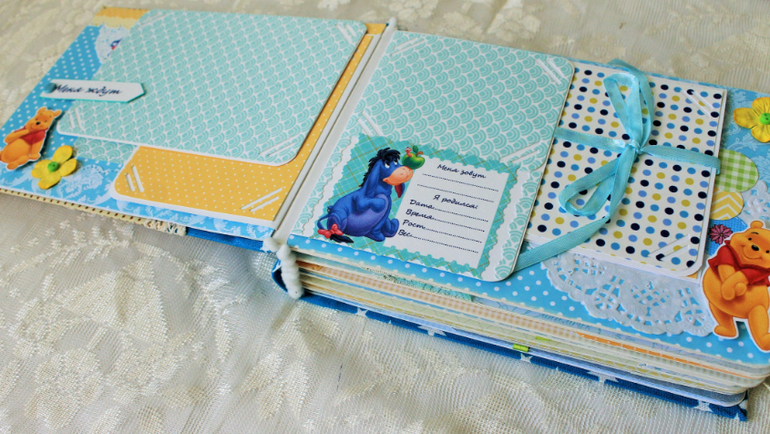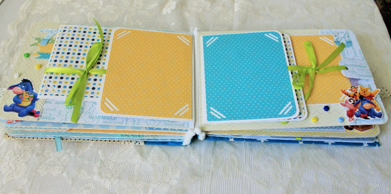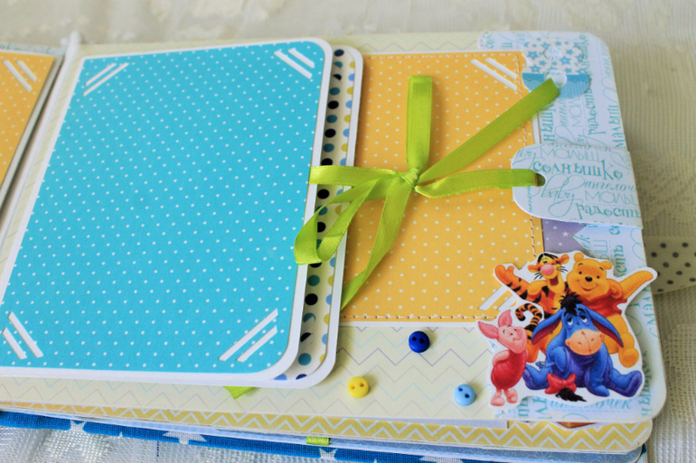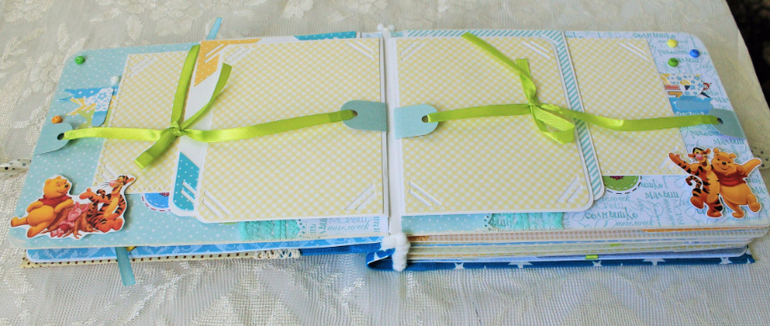 СкрапбукингПервый раз участвовала в СП Альбом с Винни Пухом "обратно в детство", было интересно! Альбомчик формата А5 (15*21см), 7 разворотов, от ожидания до 1 года