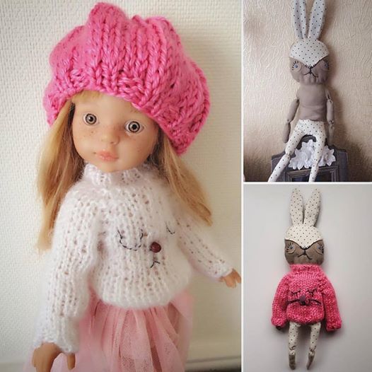 А вот такой длиноногой получилась зайка...сначала шапочку ей вязала к свитеру, но как то переборполучился и поделились с куколкой....