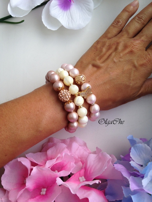 Красивый и нежный сет из трех браслетов. Выполнен из пеламутра и фактурного жемчуга Майорка.