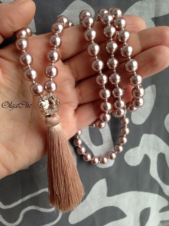 Нежнейший сотуар - выполнен из глянцевого жемчуга Майорка, шелковой кисти и кристалла Сваровски. Также использован японский бисер.