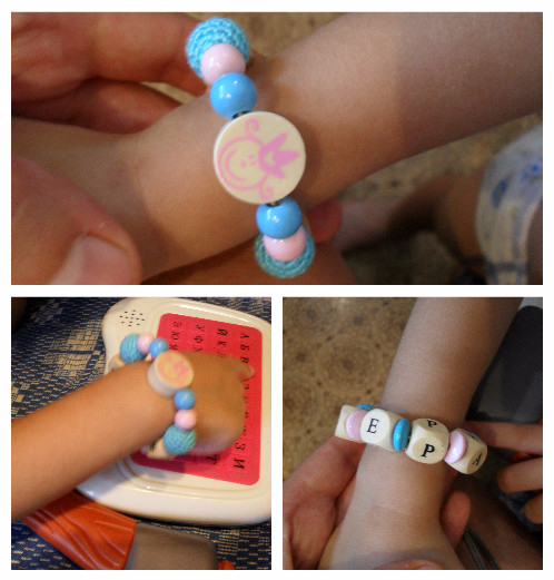 фото правда вечером делала на обычный теелфон темно получилось. это на дочке браслет. Нам еще и подарили рюкзачок со свинкой пэппой и так получилось что цвета с браслетом сошлись. смотрелось очень мило )))