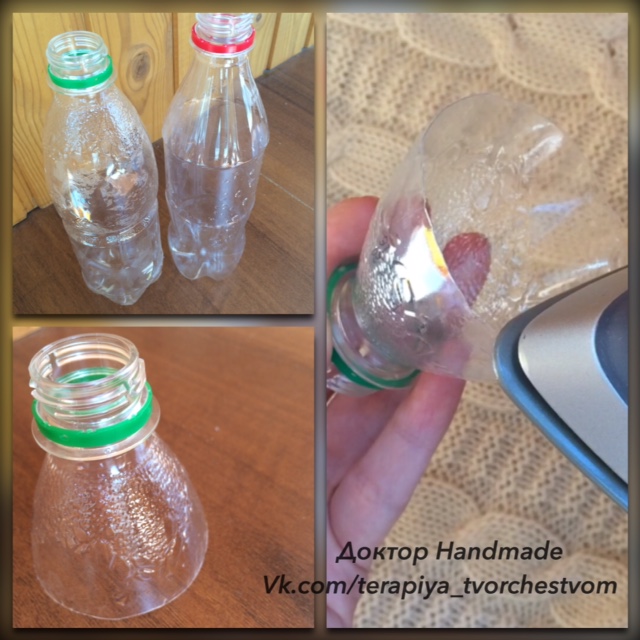 Понадобятся небольшая пластиковая бутылка, соломинки для напитков, ножницы и маленькая резиночка. Отрежьте верхнюю часть бутылки, отступив от горлышка примерно 5 см. Я пригладила срез бутылки горячим утюгом, чтобы он не поранил ребёнка.
