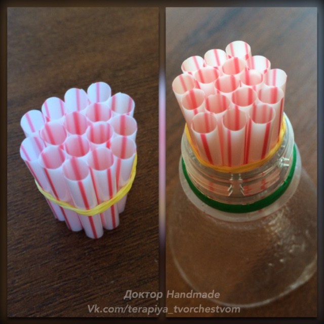 Возьмите столько отрезков, сколько поместится в горлышко бутылки (у меня 17), и скрепите их вместе резиночкой. Теперь вставьте их в горлышко.