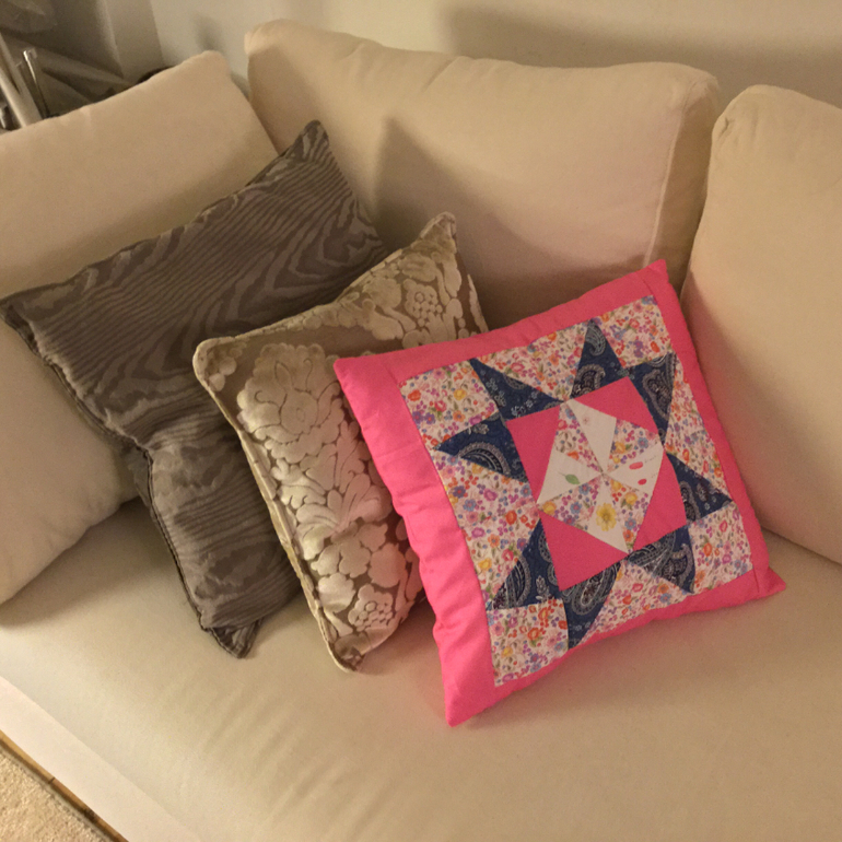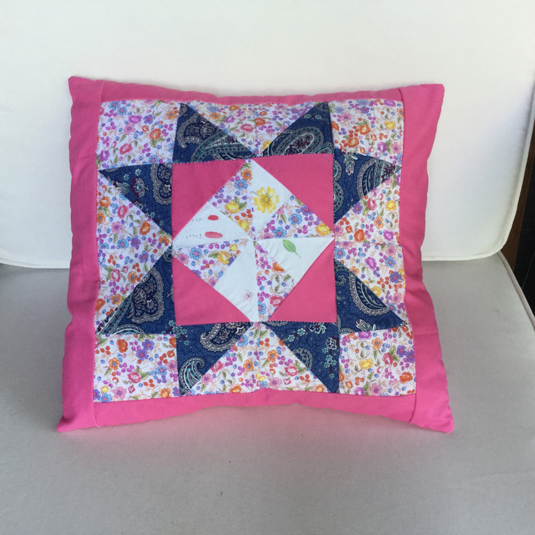 Вот я решилась на блок Martha Washington's Star , мне показался легким и эффектным ))) планы изначально были наполеоновские , хотела сшить покрывало на дочкину постель, но после первого блока подумала , что достаточно подушки на первый раз ))) на самом деле очень муторно , и ещё я шила на оверлоке и у меня все равно рисунок не совсем сошёлся , кривовато получилось .