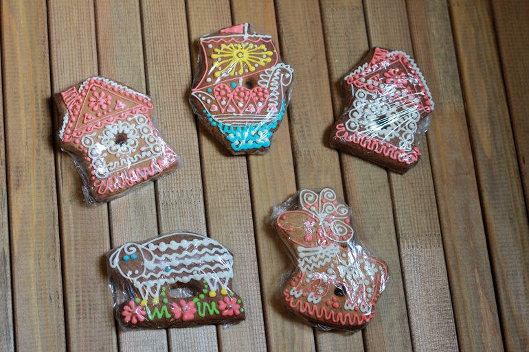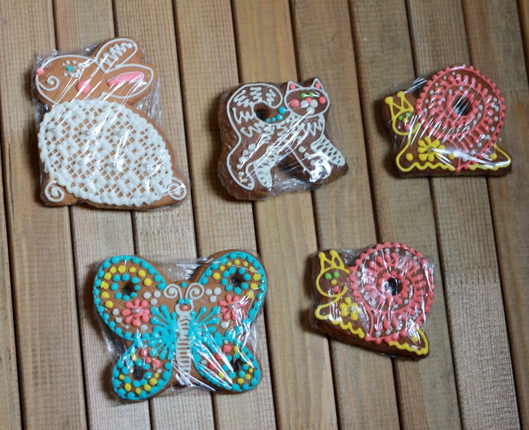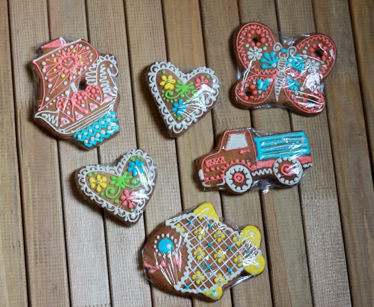 , получили мы сразу после отпуска посылку с пряничками. Их более дюжины, все как на подбор красивые, все доехали в целости. К настоящему моменту их сладкие ряды поредели, очень вкусные!
