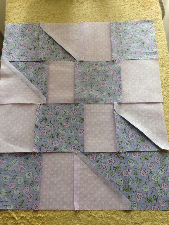 Размеры перевела в сантиметры- 8 темных и 8 светлых квадратов 10*10 см (из них шьются квадратики из треугольников) и по 24 темных и светлых квадрата размером 8.5*8.5 см. Будущие "бантики" у меня конечно получились кривоваты и я все их подрезала до размера 8.5