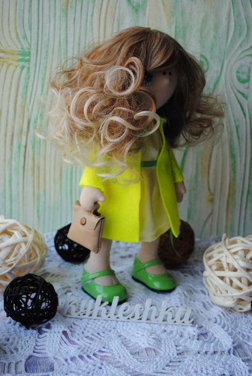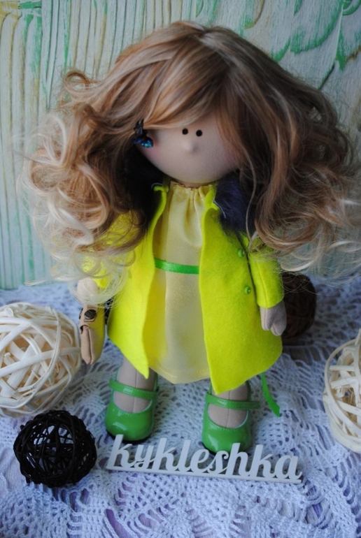 Кукольный мир - человекоподобные куклыДля одной девушки сшила портретную куколку. Малышка сшита из трикотажа, одета в платье и теплое пальтишко. Мех тосканы на воротнике пальто. Рост примерно 35 см.