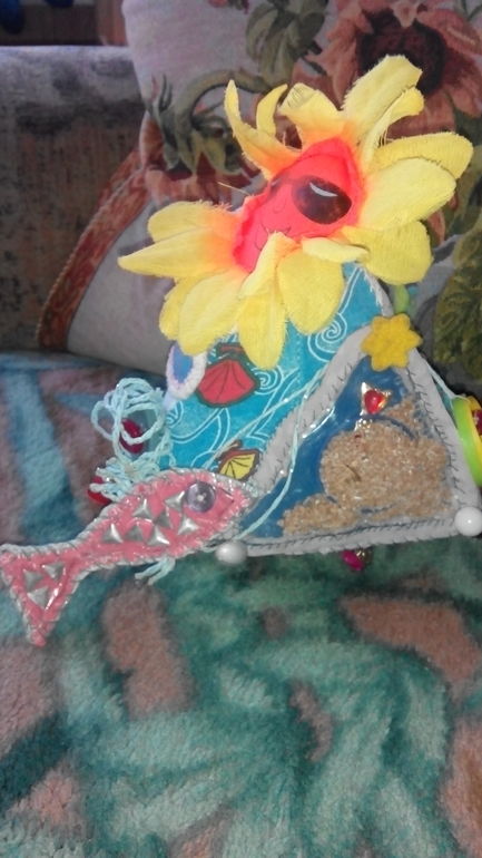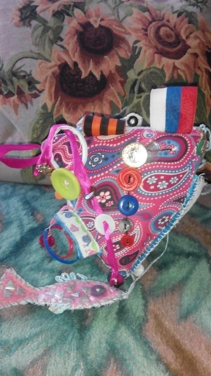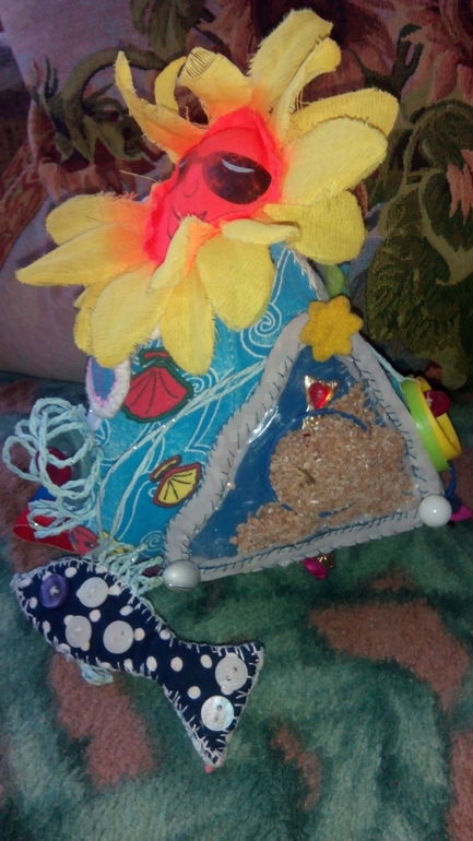 Это самая любимая сторона Алёнушки моей, "карман" это волна морская, там в песочке различные сокровища, так же жемчуга кругом. Рыбка двусторонняя, одна сторона в горошек, а вторая с "чешуей" под пластиком, вырезанным из бутылки (рыбка грызлась постоянно и тоже достойно выдержала все). Рыбка ныряет в волну и чтоб не потерялась закреплена на веревочке.