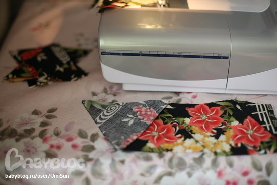 Я предварительно закрепляю булавкой центры блоков, перпендикулярно строчке, чтобы можно было прошить не вынимая булавок.