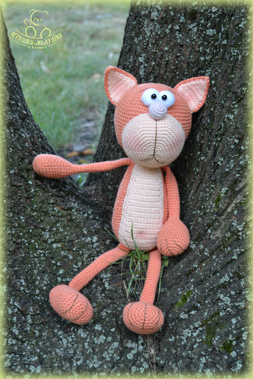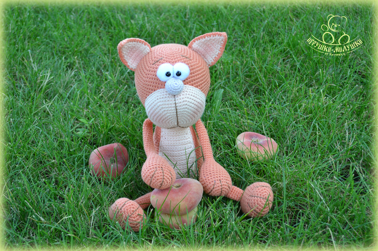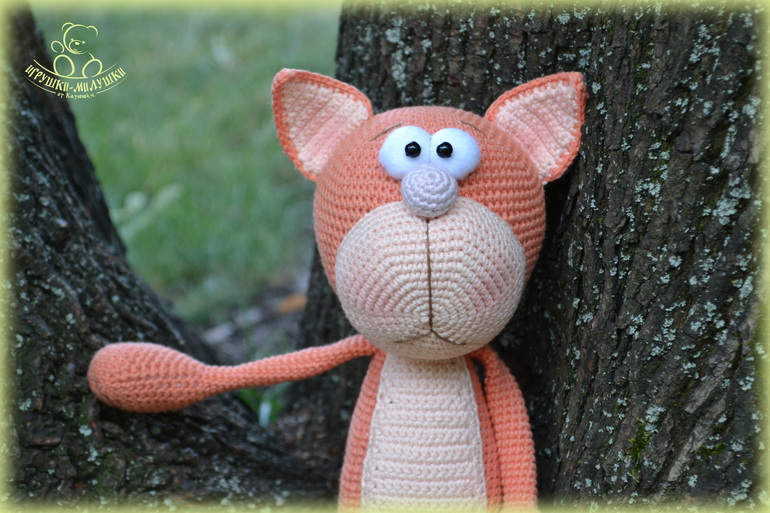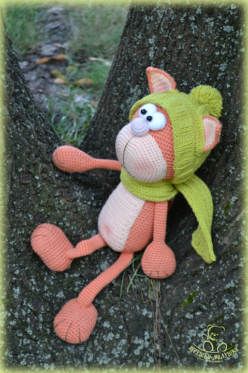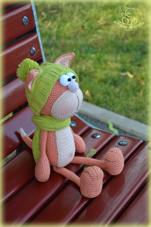 Котик связан крючком из пряжи Джинс, плотненько набит синтепоном, глазки -белки - из флиса, зрачки - пластиковые бусины. Ушки, пупочек и щёчки чуточку тонированы. Пусть сейчас лето, но котик решил приодеться - выпросил себе мягенькую шапочку с бубончиком и шарфик))