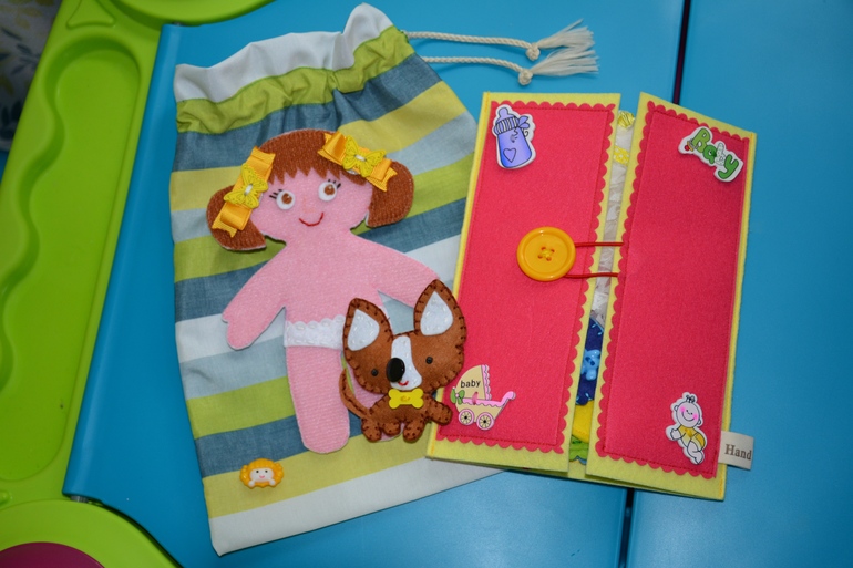 пощупать текстуру тканей, описать ее прилагательными (активное пополнение словарного запаса): ленты в бантиках гладкие, ребристые, ткань (лучше ввести название "фетр") на футболке жесткая, а на штанах - мягкая, гибкая, "теплая" (я специально использую фетр разных производителей и типов, чтобы у ребёнка было как можно больше разнообразных тактильных ощущений в процессе игры).