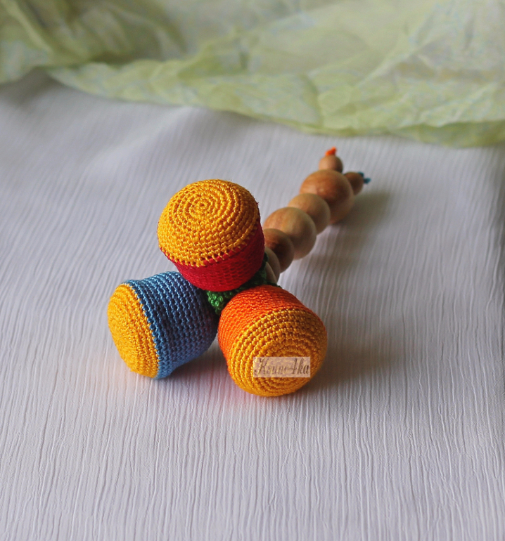 Яркий цвет способствует развитию зрения. Для развития слуха добавлены приятно звенящие бусины. Натуральные неокрашенные можжевеловые бусины обладают антибактериальным эффектом и приятным запахом. И конечно же фактура вязаного полотна способствует развитию мелкой моторики.