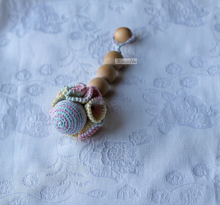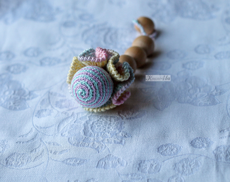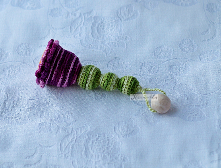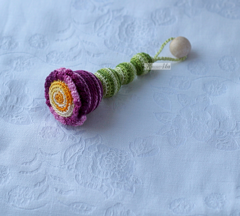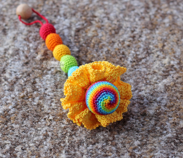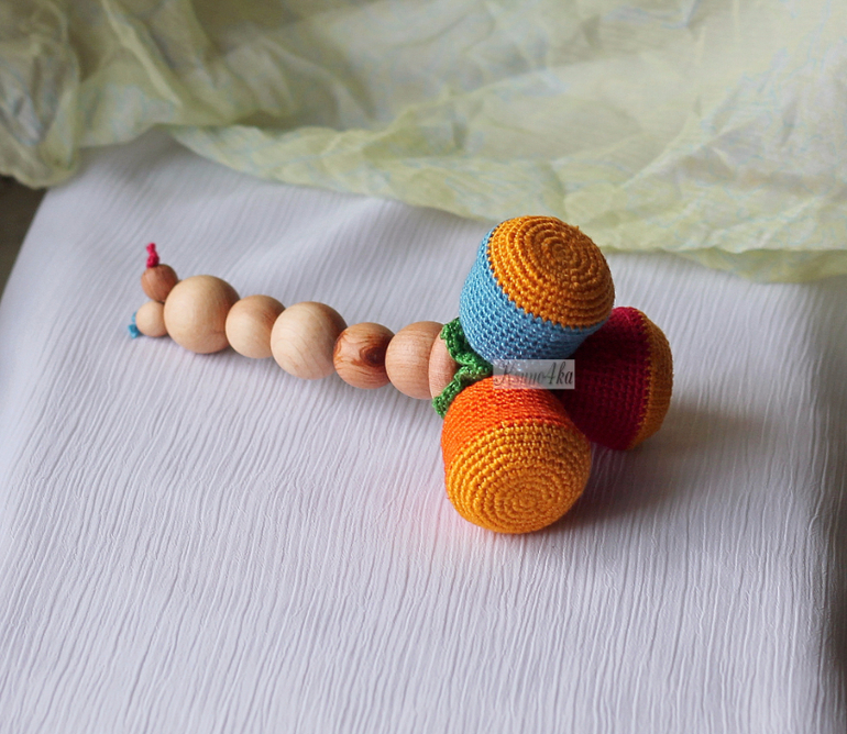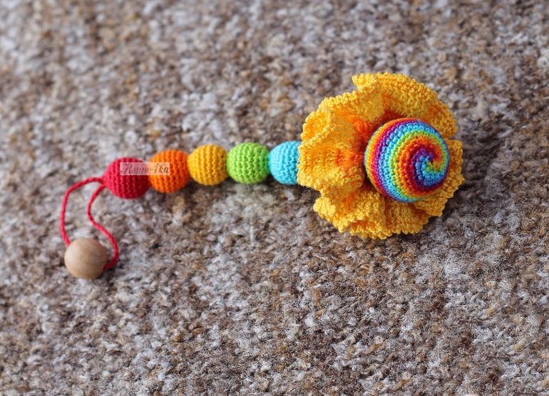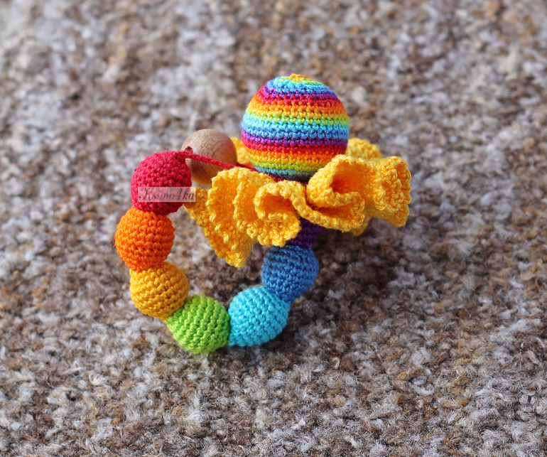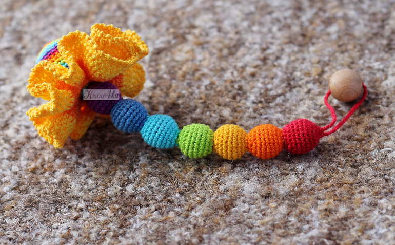 Гибкая ножка из обвязанных бусин всех цветов радуги позволяет использовать игрушку как подвеску или даже браслетик на ручку малыша.
