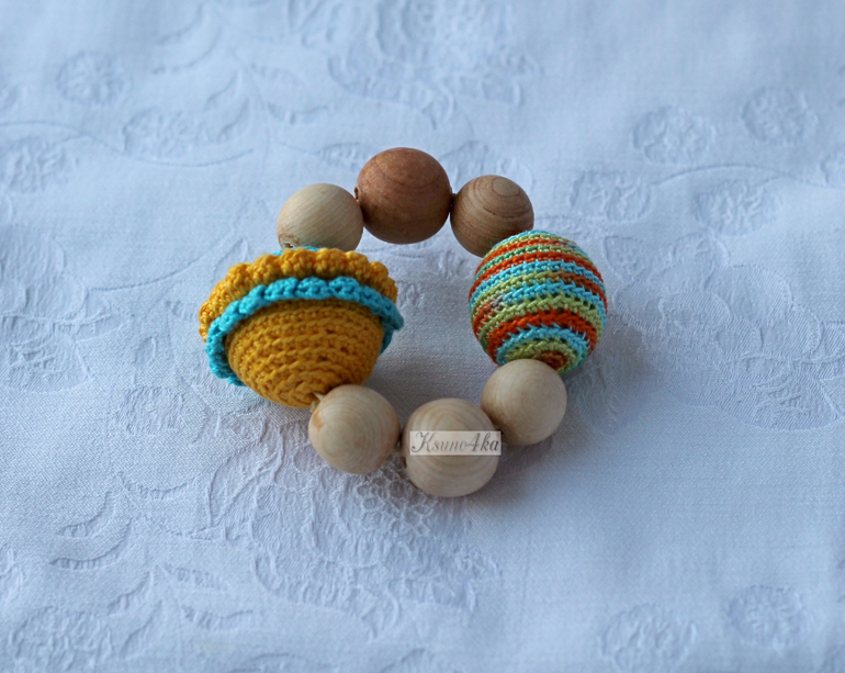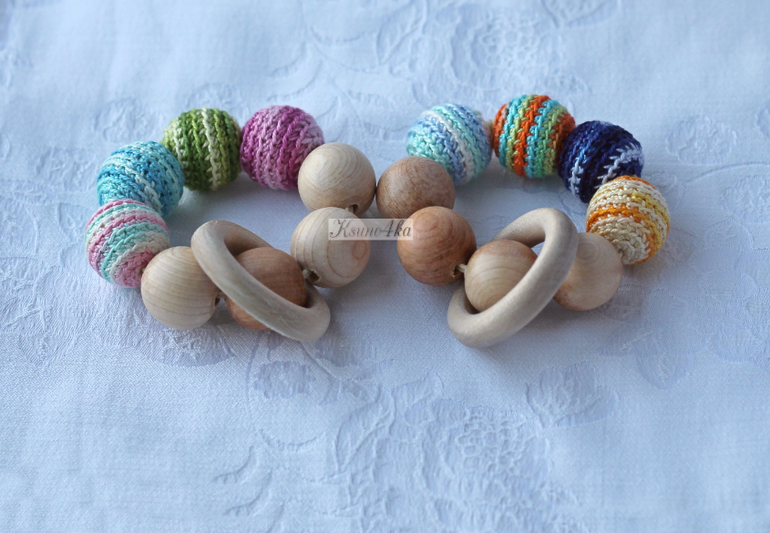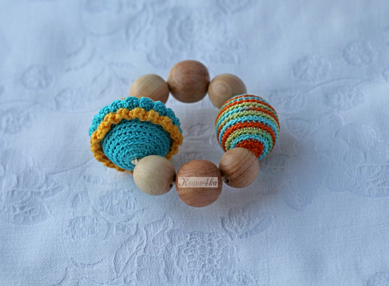 Собралась у меня небольшая коллекция работ для малышей, которую и хочу Вам показать. Из обвязанных и деревянных бусин получились погремушки, прорезыватели-грызунки, слингобусы и погремушки. Весёлые и фактурные, эти игрушки помогут развлечь малыша во время кормления, прогулок. Особенно они пригодятся малышам в непростой период прорезывания зубов. Обвязанные бусины помогают массировать зудящие дёсенки.