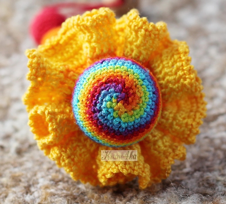 Очень понравилось обвязывать крупный шарик одновременно всеми цветами, по спирали! Было сложно, но интересно! Благодаря такому способу нет переходов между цветами от ряда к ряду. Просто магический шар получился!