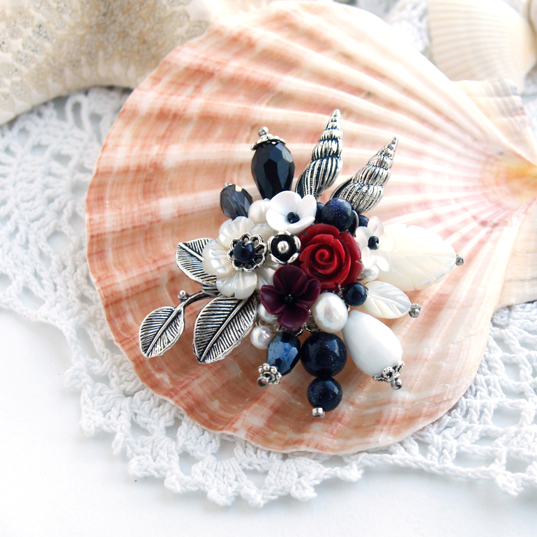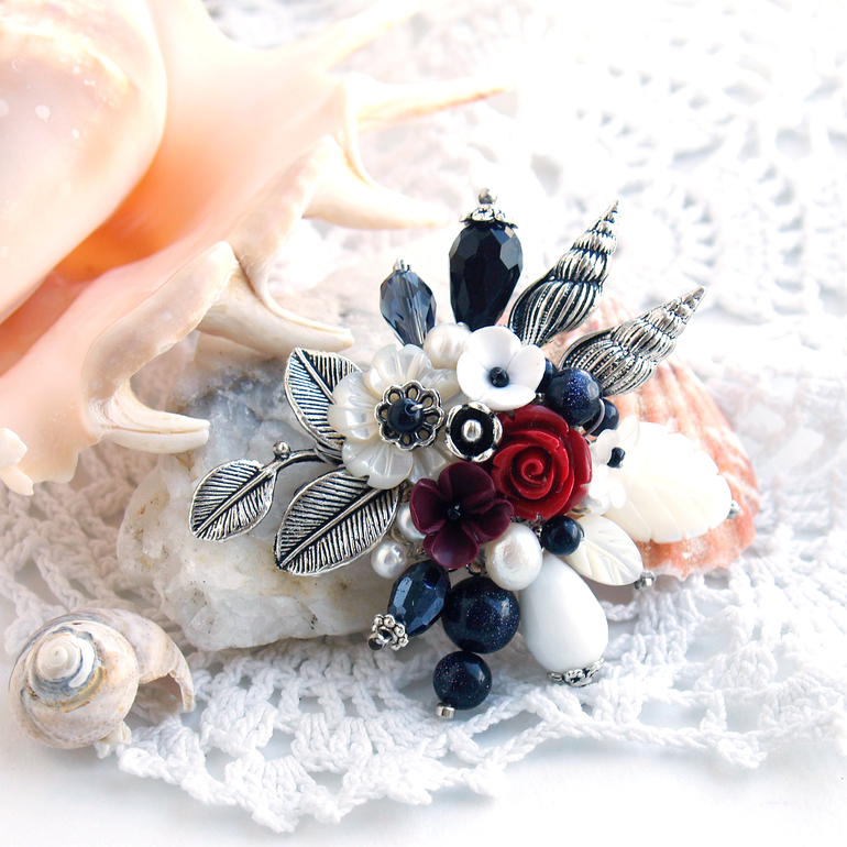 Я очень люблю морской стиль в украшениях! Обычно делаю "морские" броши и браслеты. А тут решила собрать брошь. Вот такой комплект получился!