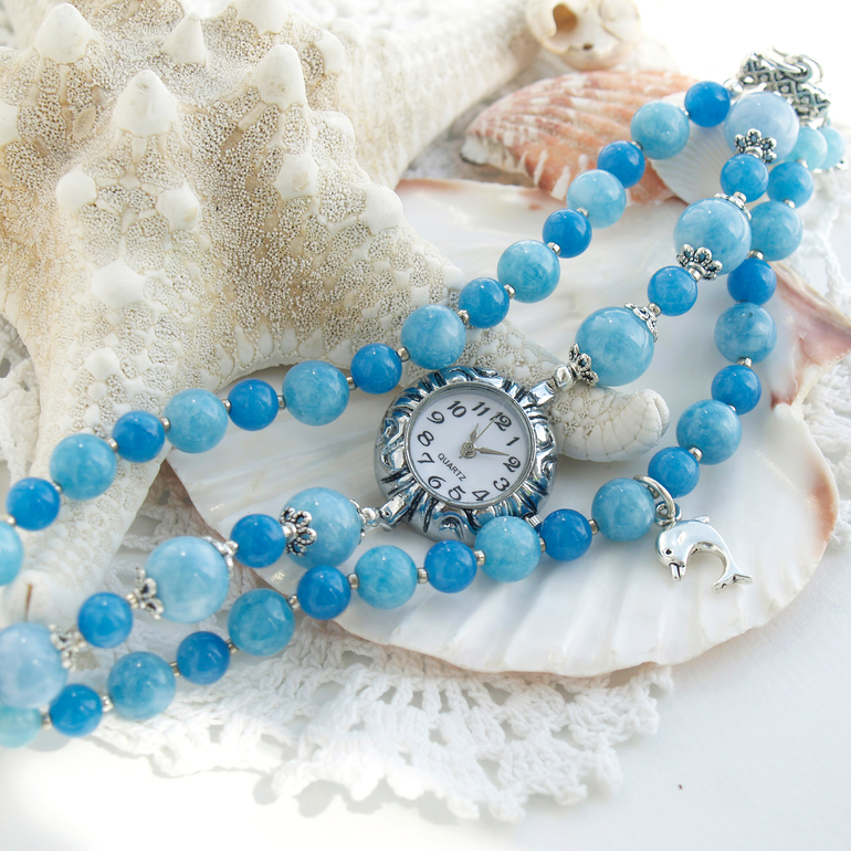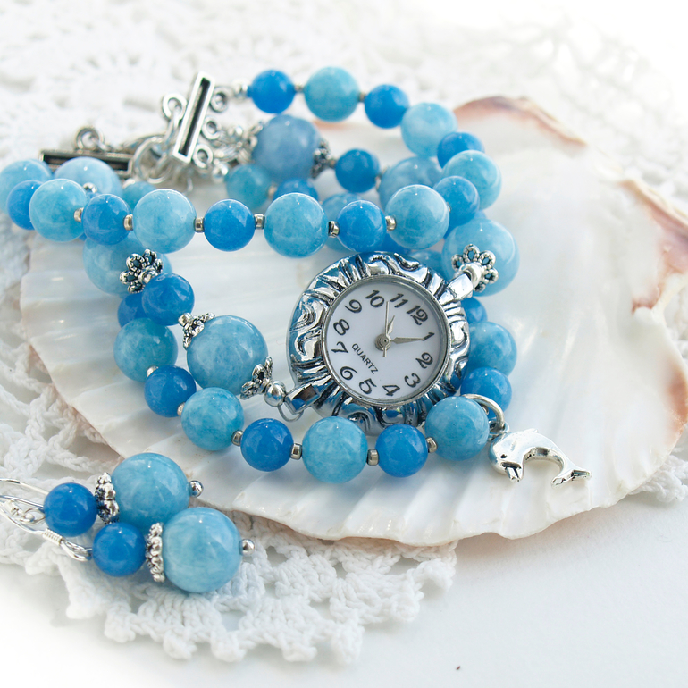 "Волны цвета неба" - часы и серьги