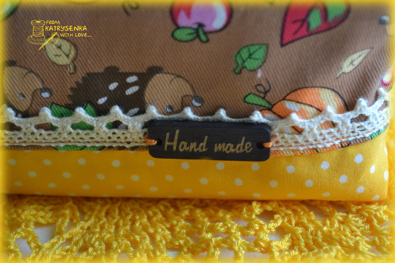 Тканюшка, неизвестного мне происхождения (ни страна производитель, ни состав не известен) - плотненькая, больше хлопок нежели лён (дублировать не пришлось), в компанию ей желто-оранжевый немецкий хлопок в горошек, в качестве уплотнителя фетровая салфетка, украшена косметичка льняным кружевом и деревянной нашивочкой "Hand made", чтобы подчеркнуть ручную работу))