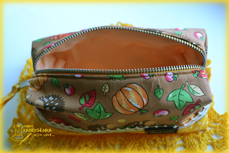 Застёгивается косметичка на молнию с металлическими зубьями, на бегуночке пришила хлястик, чтоб удобнее растёгивать, подкладка - украинский хлопок нежного персикового цвета.