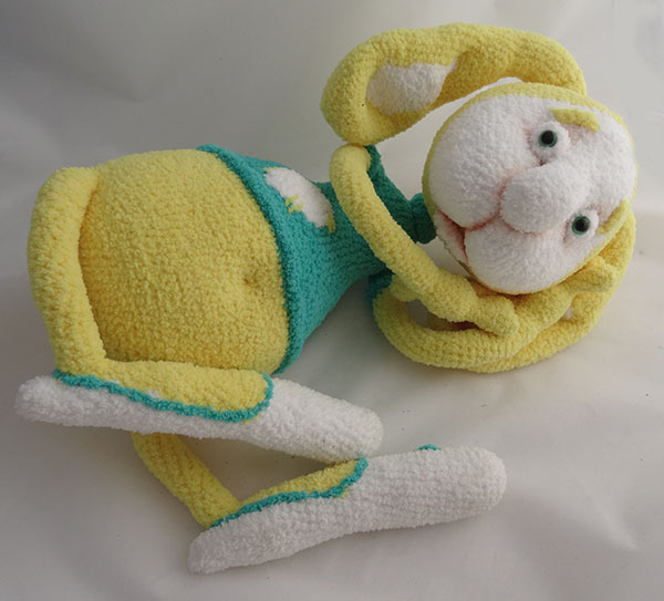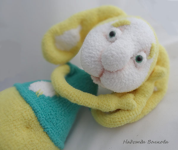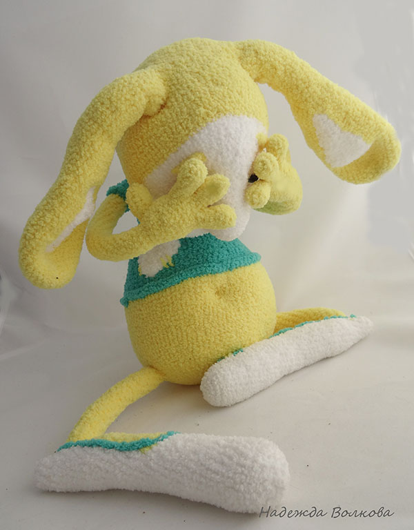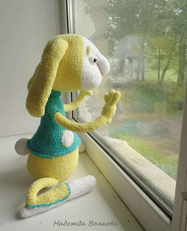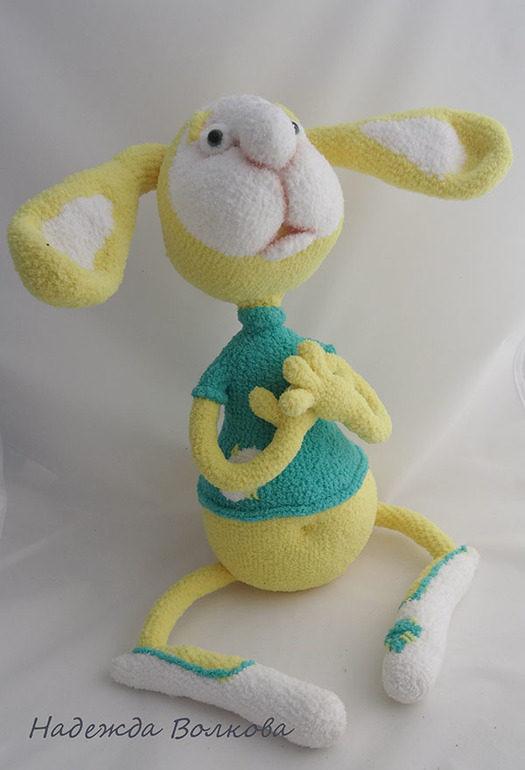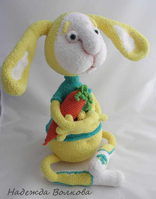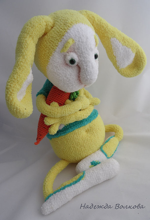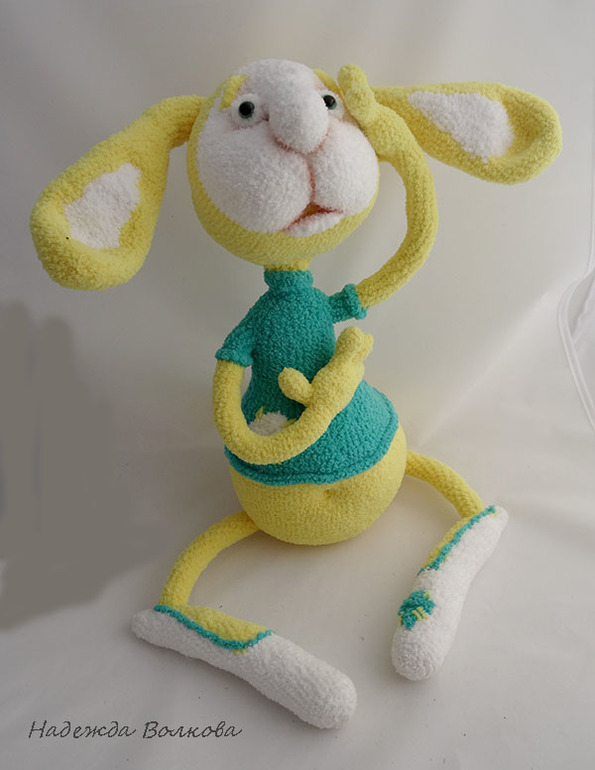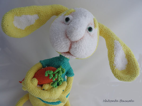 Амигуруми (вязаные игрушки)Зайка Заплаткин связан по мк Светланы Перцевой, пряжа Софти, крючок 2. Зайка не армирован, захотелось "болтунчика", рост сидя 35 см(без учета ушей) тонирован пастелью. В пузико вшит озвучивающий блок, зайка благодаря этому говорит простые фразы: хочу кушать, хочу пить, давай поиграем, пойдем гулять...