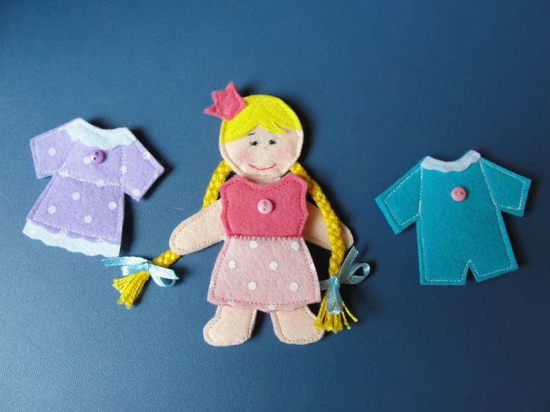 В шкафчике два платья и пижамка. Они крепятся на куколку с помощью липучки.