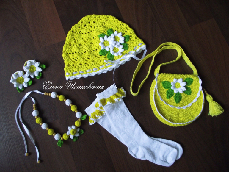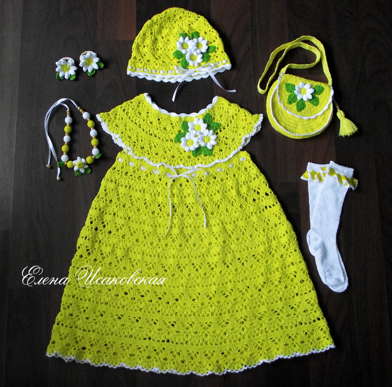 Вязание крючком (РАБОТЫ И СХЕМЫ)Связался вот такой комплект: платье, шапочка, сумочка, бусы, гольфы и резинки для волос. Использовала пряжу Софт Коттон (желтая) , и Коко.