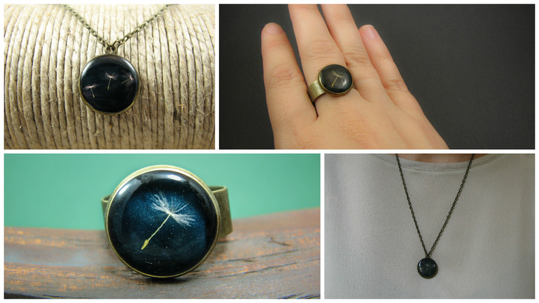 Хоть черный и совсем не летний цвет, кулон и кольцо получились очень летними и стильными. Одуванчик на черном просмотривается во всей красе.