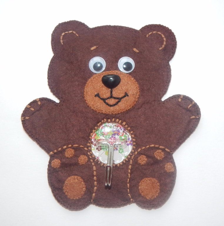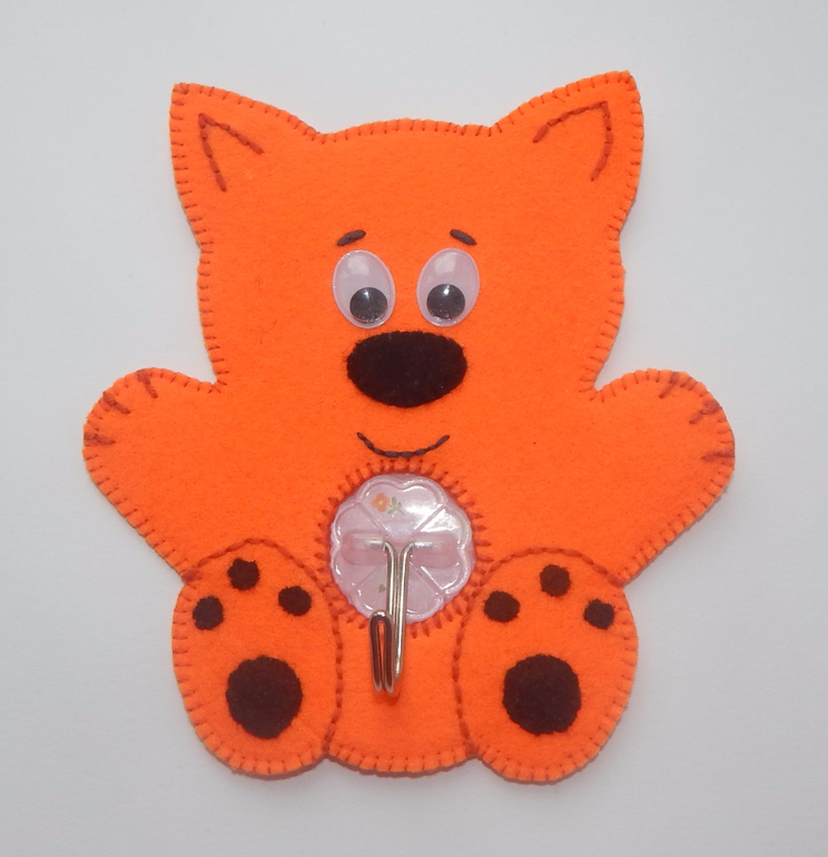 ФетрВот такие крючки для детей я сшила из фетра. Крючки-стикеры легко крепятся к ровной поверхности. Наша вешалка для полотенец весит высоко и младшая не может дотянутся до неё. Вот я и решила повесить дополнительные крючки для детей чуть пониже, немного их приукрасив. Далее 4 фото.