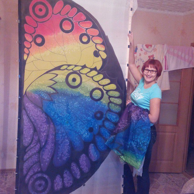 О крыльях... Размер КАЖДОГО крыла 2,4 на 1,2 метра!!! Понадобился натуральный шелк, чтобы крылышки не висели,а были легкими, воздушными, краски специальные по шелку, всё действо заняло неделю (рисовала после работы) и потребовалась отдельная комната под раму... далее фото.