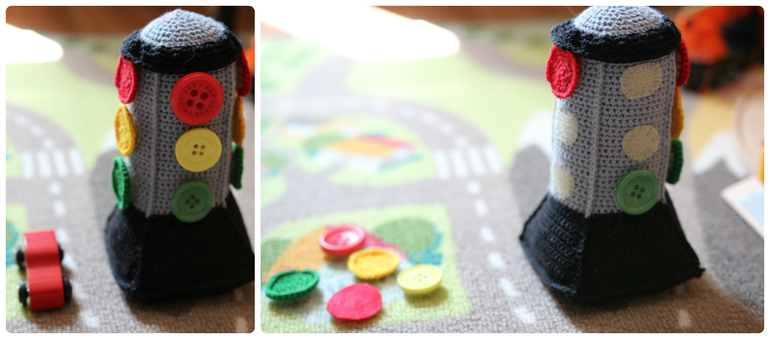 Амигуруми (вязаные игрушки)Вот такой светофор связала сыну. Две стороны - вязаные кружочки, третья сторона - пуговки, четвёртая сторона - кружочки из фетра.