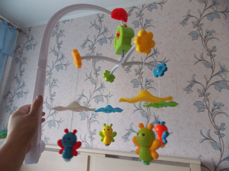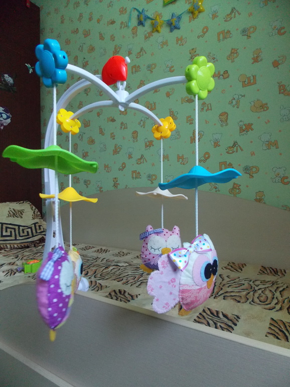 И получилось вот что (кроватка еще не собрана, поэтому мобиль позировал на кровати сына)