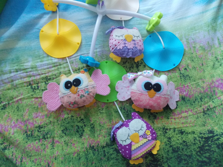 ФетрВо второй половине Б стала отменять все заказы - тяжеловато стало работать с животом, да и после того, как загремела в больницу - боялась подвести людей...Но, речь не о том. Начался "синдром гнездования" и, помимо домашних уборок и стирок прям захотелось что-то пошить для дочи. Тут как раз началась пора закупок, купили мы мобиль (карусельку) в кроватку, выбор на ахти. Захотелось чего-то особенного...И я сделала вот что