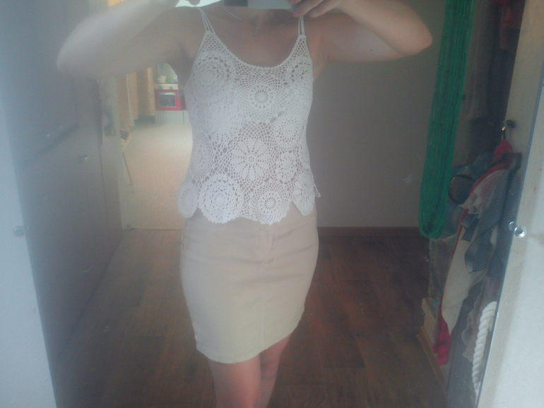 С беж бюстгалтером будет хорошо смотреться, но и так не плохо. вязка не сильно ажур, фигура хорошая. Порнография- это когда носят прозрачное бабушки. А вам очень даже хорошо и не вульгарно с этой юбкой.