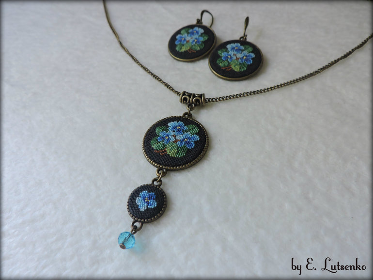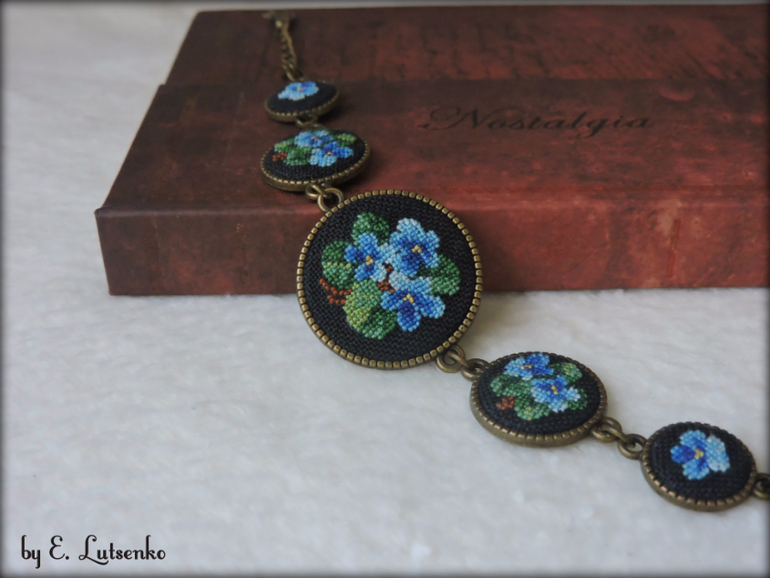 Продолжаю коллекцию со старинной вышивкой 19 века! На этот раз комплект с голубыми фиалками: браслет, кулон и серьги! Много фото...