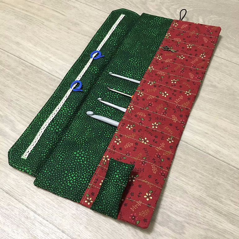 У меня здесь крючки вложены обычные, у нее с пластмассовыми широкими ручками. Поэтому кармашки такие широкие. Также имеется подушечка для иголок и тесьма с петельками для маркёров.