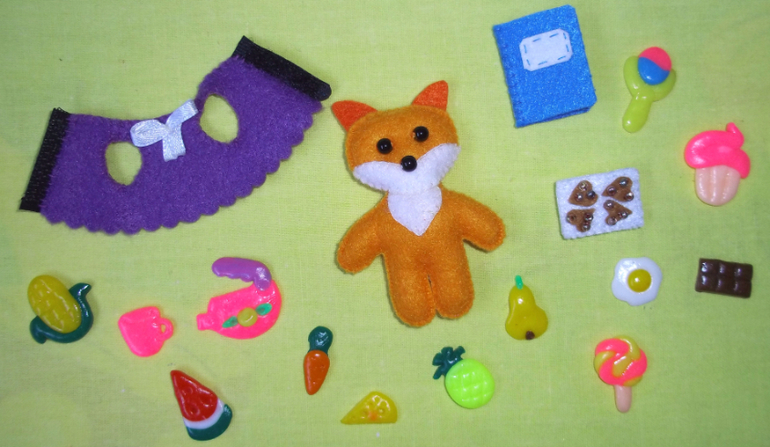 У лисенка есть платьице, игрушка- погремушка, книжка и много всяких вкусняшек (их я лепила из полимерной глины)