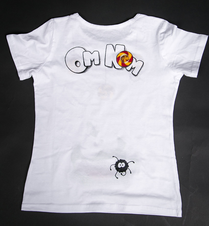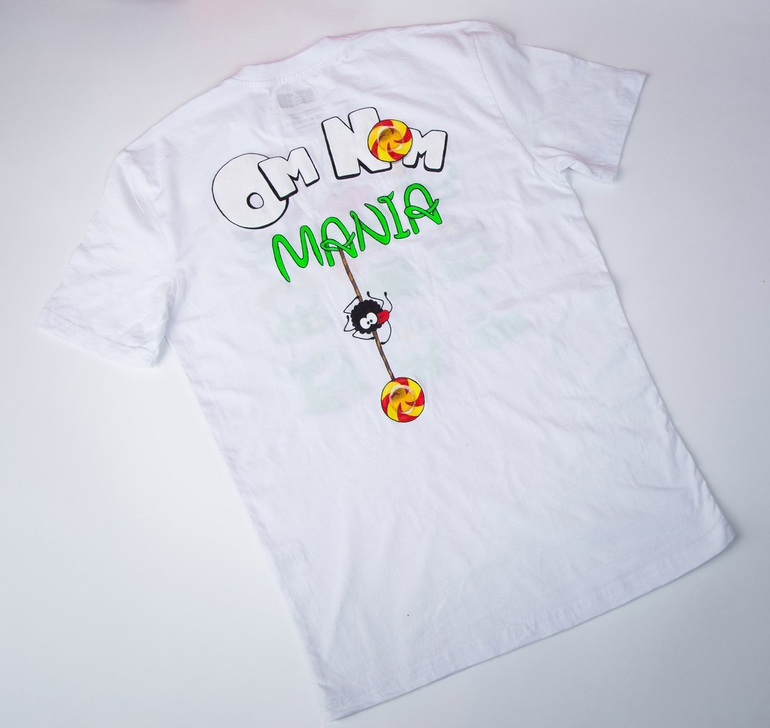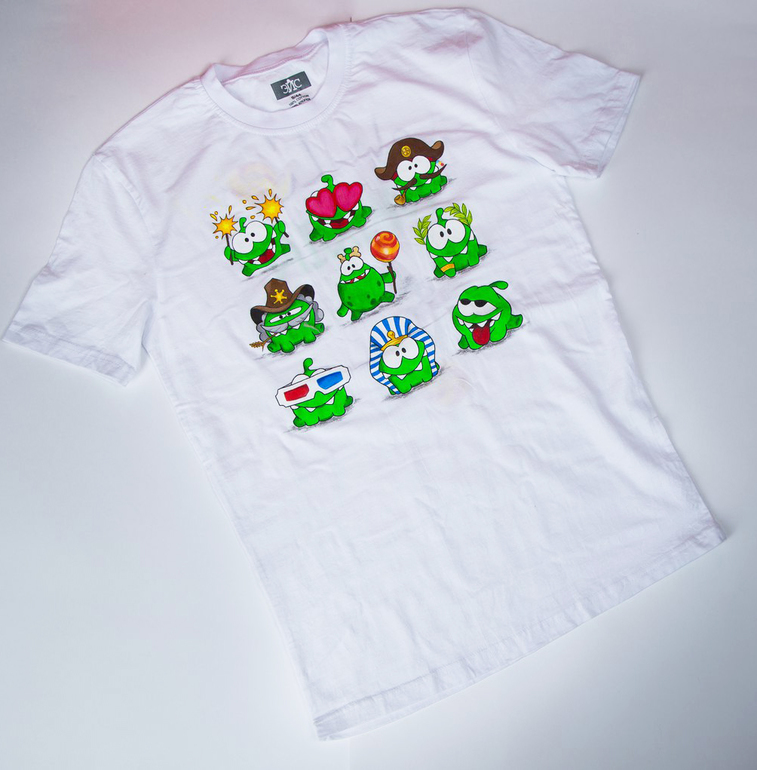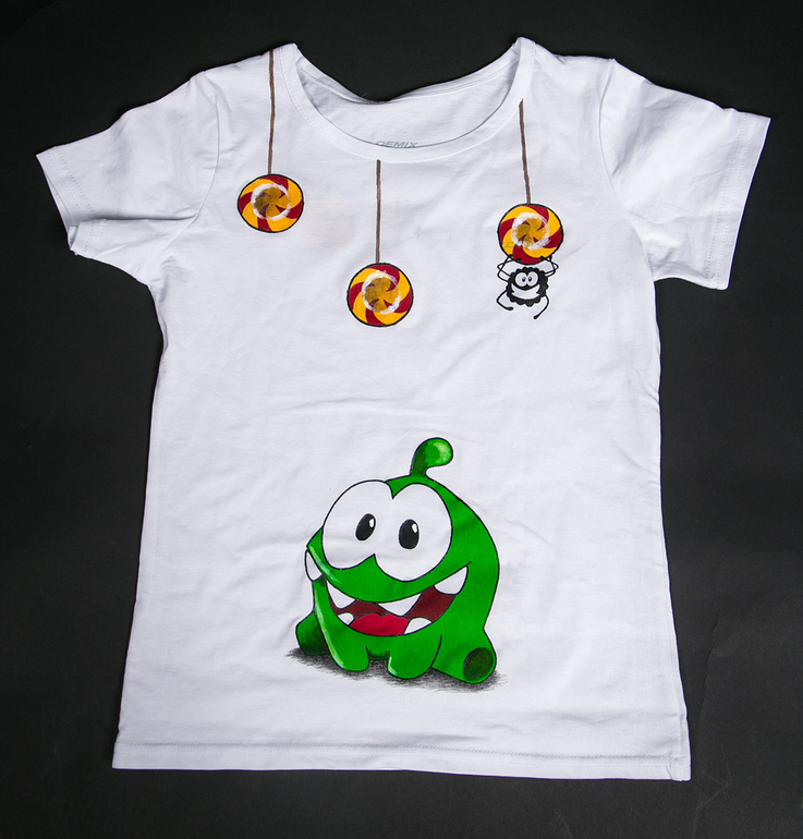 Роспись по ткани, батикДумаю, все знают такого популярного лягушонка (да да он лягушонок типа) сластёну - Ам Няма, героя игры. Моя дочь тоже оооочень любит его, да и вообще, его любят не только дети, но и взрослые!!! Лично я мечтаю найти время, чтобы сделать и себе футболочку с Ам Нямом...