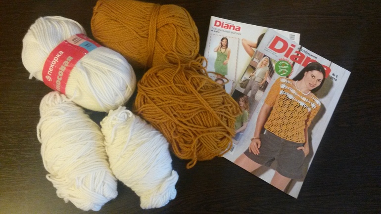Пряжа 50% шерсть, 50% акрил. 3 белых моточка и 2 золотисто-коричневых. И 2 журнала по вязанию. Моточки начаты, пыталась связать себе шарф-хомут, но получилось не то что хотела, поэтому распустила.