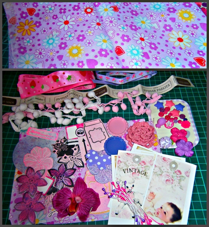 Отрез ткани 40х50 и украшалки для скрап работы в розово-сиреневых тонах. Пуговки,кружево, ленточки,цветочки и другая красота.![]()