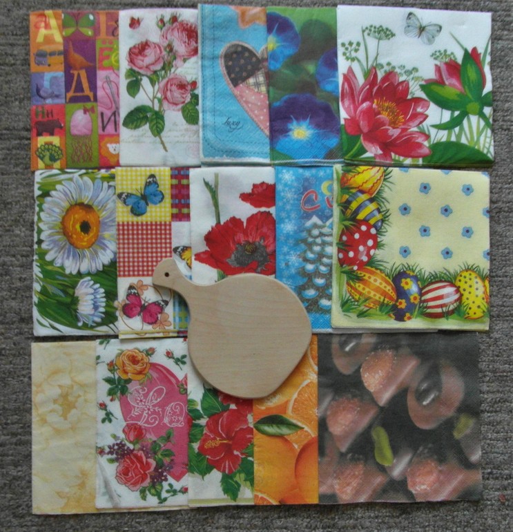 Салфетки для декупажа (по 2 шт каждая-1 и 2 ряд, по 1 шт - 3 ряд) и доска для декупажа.