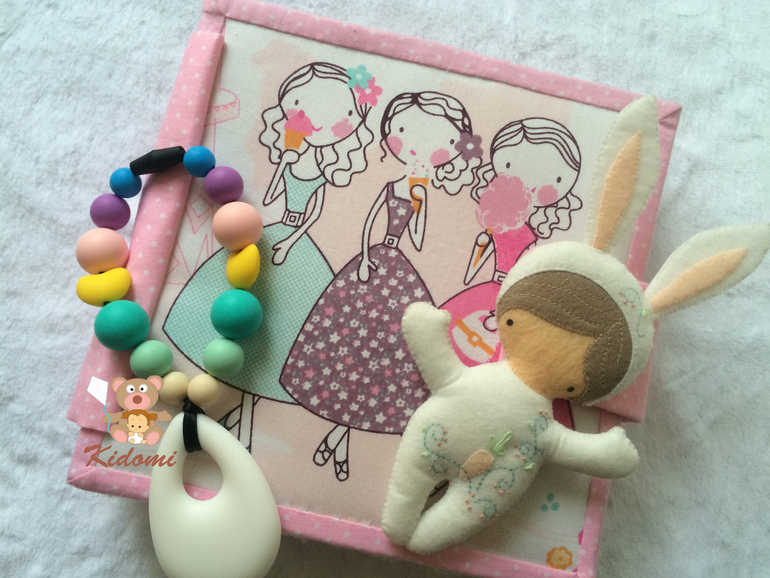 Особенностью этой книги является не только цветовая палитра, но и дополнительные детали - маленький "грызлик" из пищевого силикона в нот к книге (ведь маленькой принцессе еще только исполнится 1 годик и она пробует этот мир на зубок) и белый объемный зайка, с которым всегда можно поиграть.