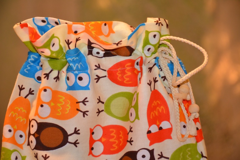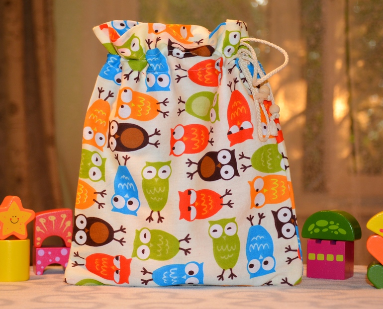 Хранится игрушка в мешочке с совушками. Ткань для пэчворка - яркий, плотный, но эластичный хлопок.