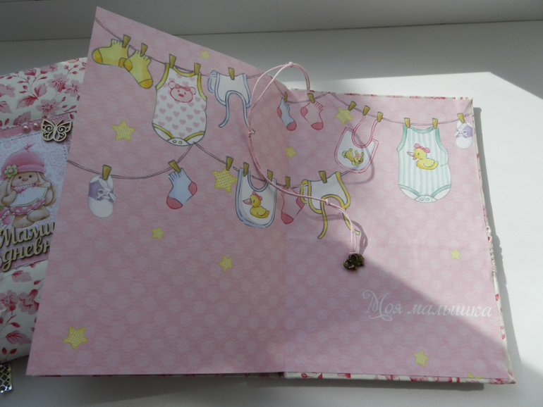 Это Мариночкин. Он рассчитан для записей о крохе с рождения до года. есть 2 конвертика для бирочек и первого локона. Закладка с милой подвеской слоником. и места для вклеивания маленьких фото!