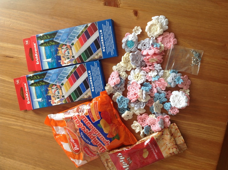 Обмены подарками, материалами для рукоделия (хвастики)Отчитываюсь по цветочному обмен с Юлией (не могу с телефона вставить ссылочку). Навязала мне Юля цветочков, ещё и подарочки деткам и сладенькое;) спасибо большое