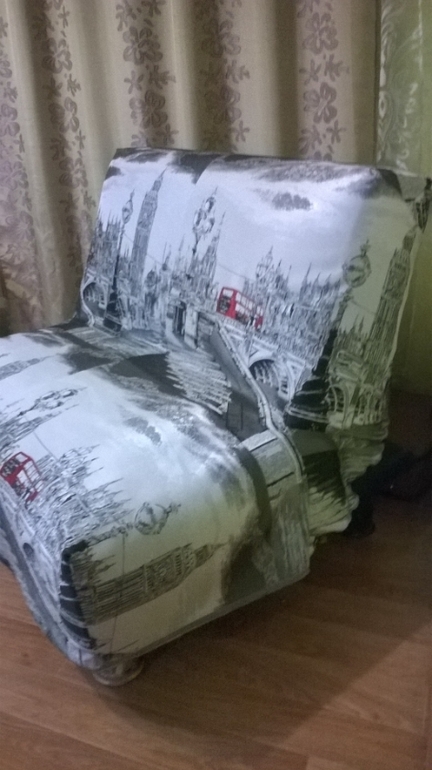 Пошился сегодня за пару часиков чехол для такого маленького диванчика. Диван на работу, тематика не случайна, школа английского. В общем, вот: