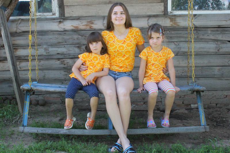 А это наши апельсинки-витаминки: футболочки для дочки,племяшки и сестры. Family look так сказать:))) Моя дама, как всегда, не в настроении...