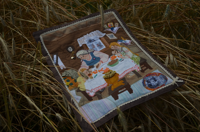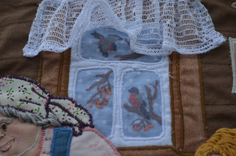 В этой работе много вышивки художественной. Вообще было очень интересно работать, не хотелось ограничевать себя только лоскутной техникой, хотелось объёма))) так пришла идея лепки отдельных деталей из застывающей пасты. Снегири за окном вышиты, они очень яркие получились и как живые, но чтобы создать эффект застеклённого окна, пришлось закрыть тканью. Ну а далее фото... Буду рада любым Вашим комментариям!!!