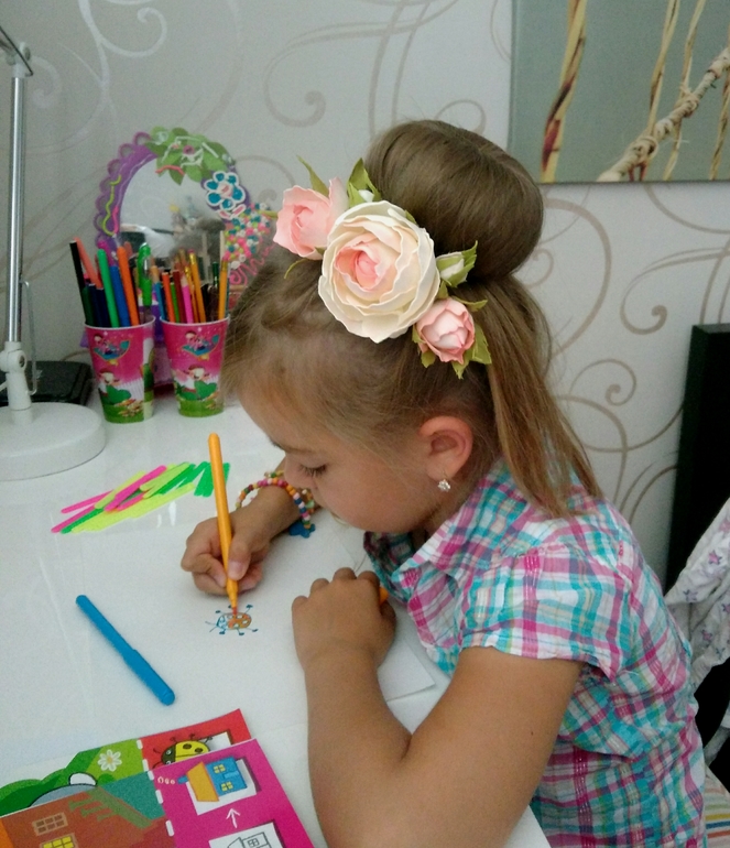 Заколочки чудесные, но в первой фотке уберите вон те ноги выше головы ребенка (подрежьте фото) . Спортивные штаны с лампасами и ботинки узконосые, даже не смогла рассмотреть цветок от души. С красотой рядом такого ужаса быть не должно.Если это блик, все равно не так как то.
