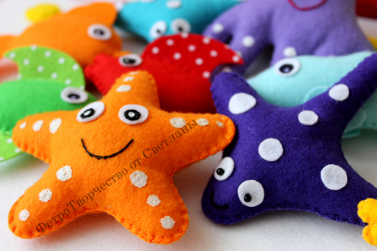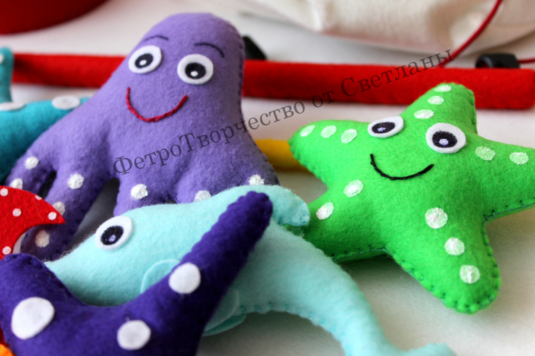 Да, морские обитатели сшиты вручную . Я любительница шить из жесткого фетра и на машинке , но " Рыбалку " и елочные игрушки шью из мягкого фетра и вручную.